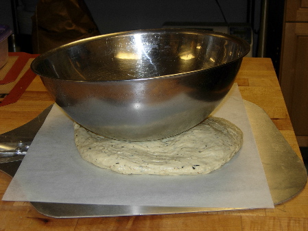 Whoops! Remember to put the parchment paper under your pizza dough and the TOPPINGS on top, not the bowl!