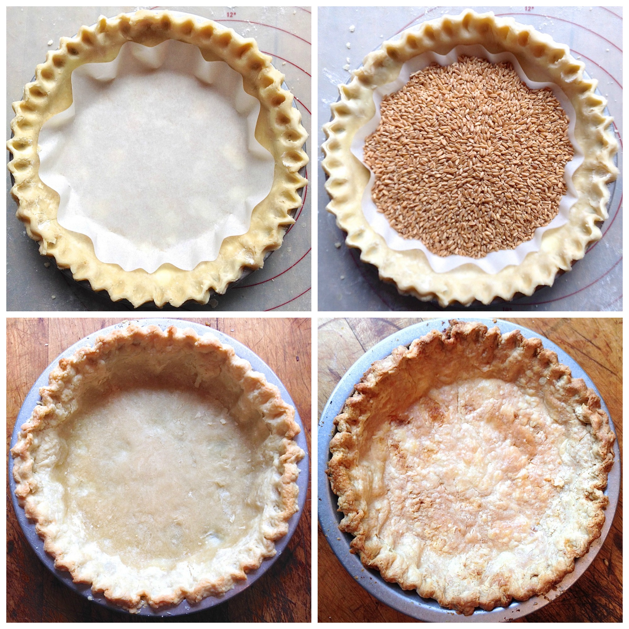 Pre-baking pie shells just became easy as, well, pie. A piece of parchment to hold the pie weights, coins, or in this case wheat berries helps keep the bottom of the crust flat, and makes removing each little wheat grain a breeze.