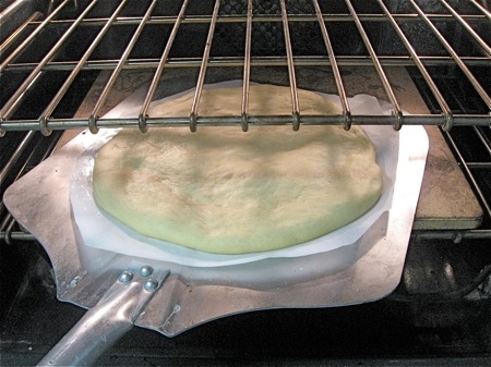 3. Shape your pizza dough on it and transfer, parchment and all, to your baking stone.