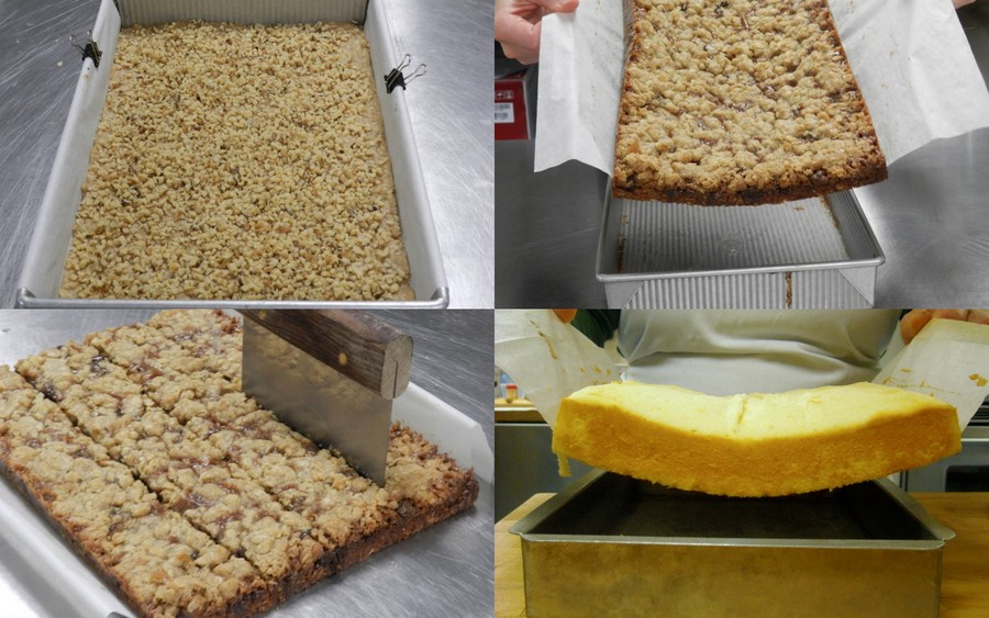 5. Line your 9" x 13" pan with parchment, and clip it to the edges (we use metal spring clips from the office supply store) before baking bar cookies or a cake. When done, you can lift out the whole batch in one motion, and cut them outside the pan (MUCH easier without that rim).