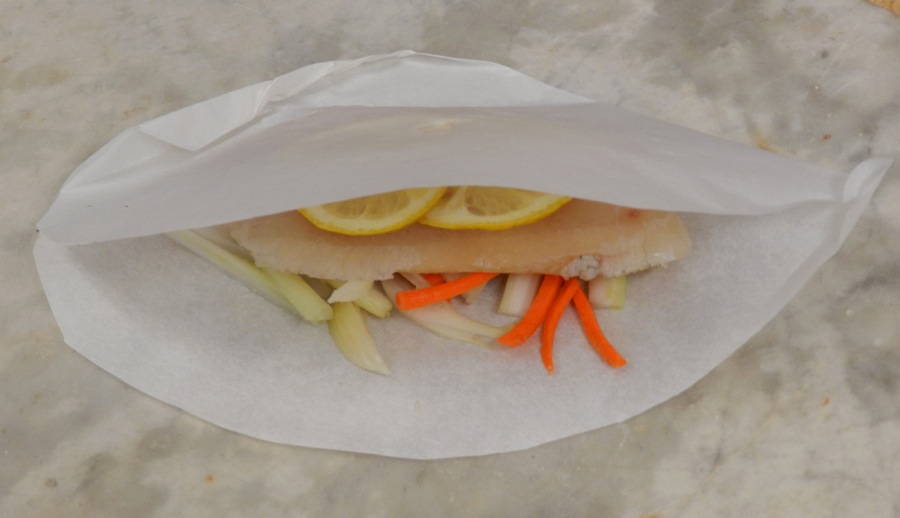 9. Fold around fish, herbs, and seasonings to cook "en papillote."