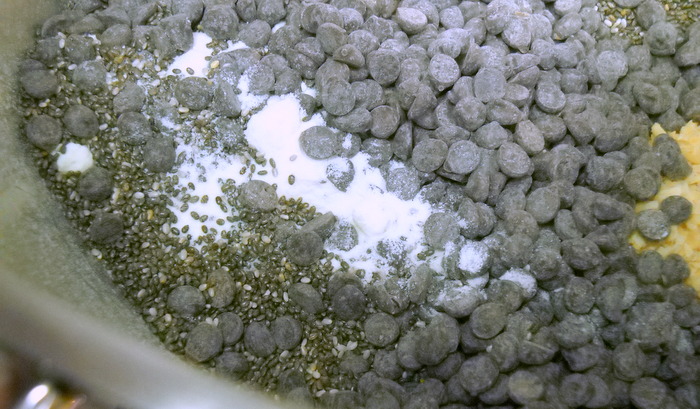 For mix-ins, you'll want to use about 2 cups total. I already stirred in 1/2 cup toasted coconut, so I still had 1 1/2 cups to add. I put in 1 cup mini chocolate chips, and 1 tablespoon chia seeds*. You can see on the left that I added 1/4 cup coconut milk powder too, a last-minute inspiration.
