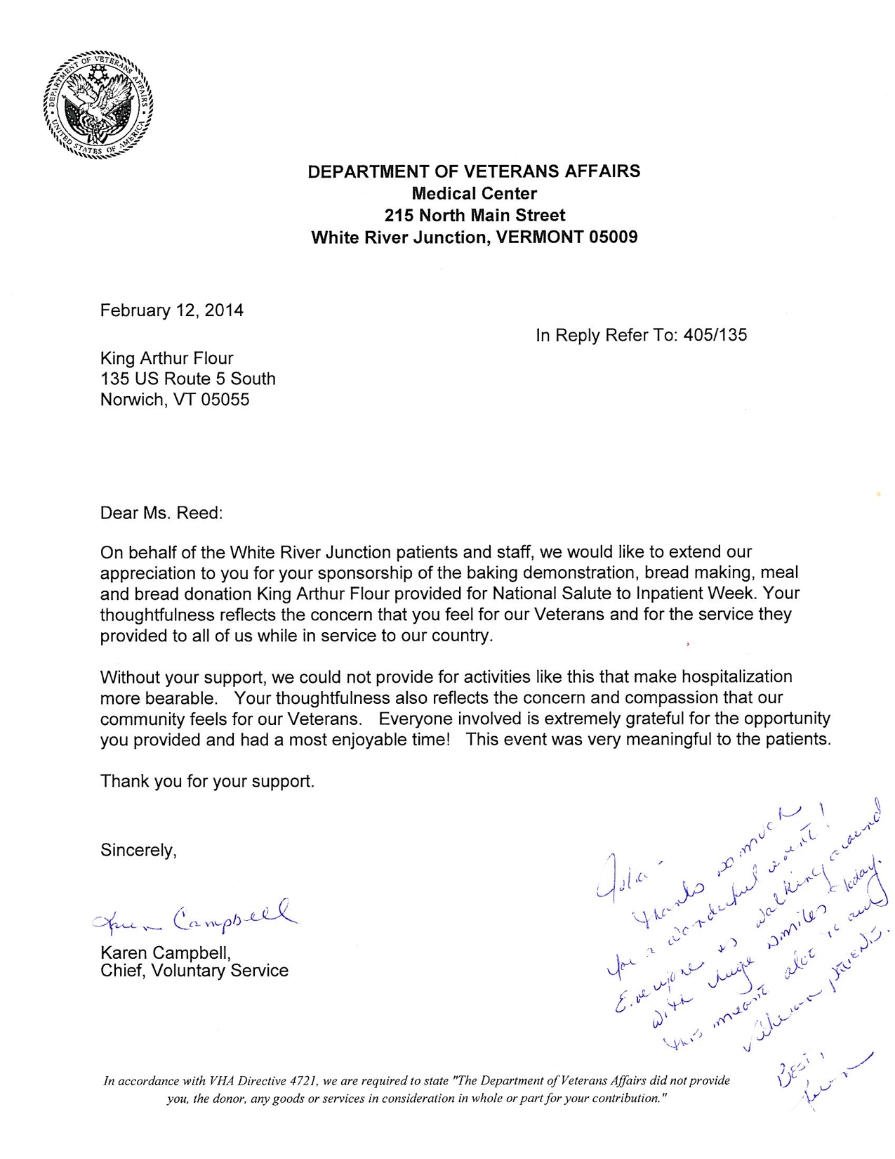 Recently, though, we undertook a project that was a bit more complex. King Arthur Flour public relations coordinator Julia Reed organized a program for local veterans from the White River Junction (VT) Veteran's Administration hospital, bringing them to the King Arthur Flour Baking Education Center for a whole wheat bread-baking class...