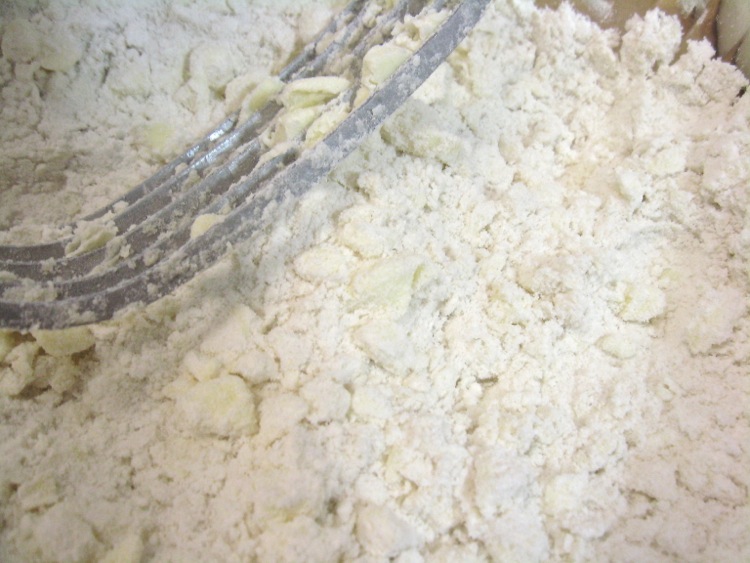 Once the fat is cut in, the mixture should be crumbly-looking, with pea-sized pieces of butter.