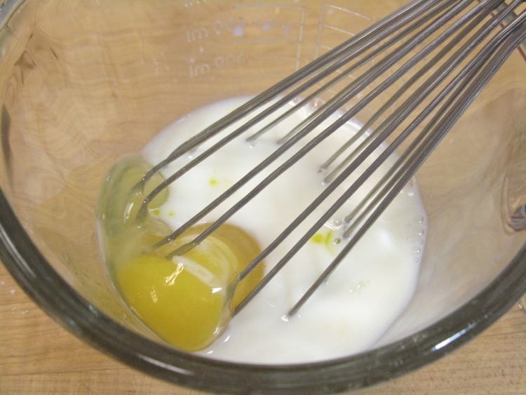 In a separate bowl or measuring container, whisk together 1/2 cup (113g) milk and 2 large eggs.