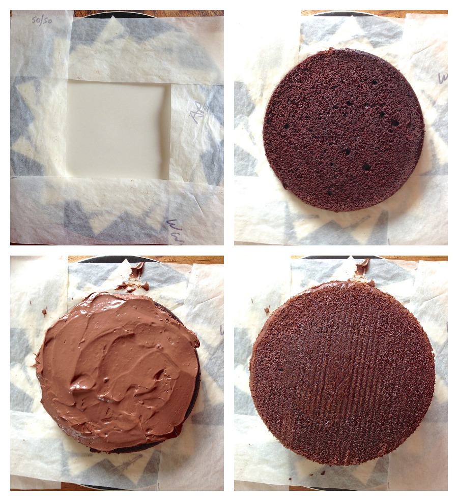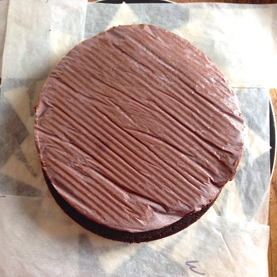 Unfortunately, by that time the pan was no longer centered over the cake. So after peeling off the parchment, I had to take a spatula and noodge and spread the filling from its precarious overhang on one side of the cake, to the bare edge of cake on the other side.