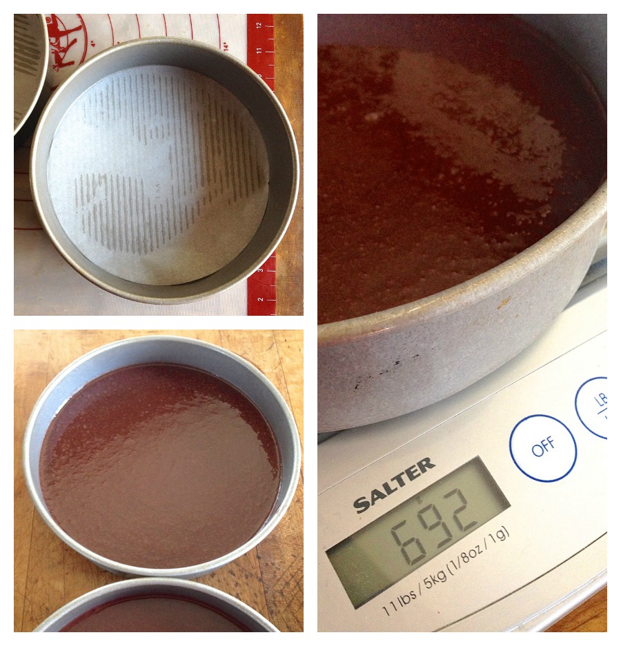 Pour the batter into the prepared pans. It's easy to divide the batter evenly between the pans when you use a scale.