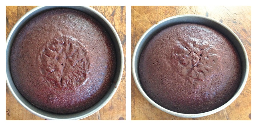 Cut the domed tops off both cake layers; these will become your crumb coating, so hide them somewhere where they won't get scarfed up by your "little helpers."
