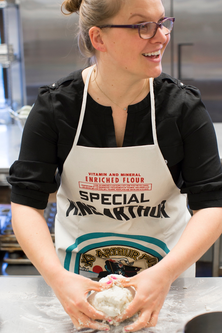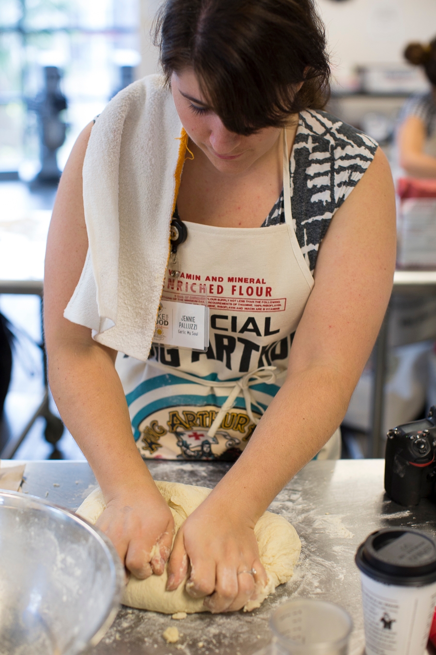 Amber shows Maria (Pink Patisserie) how to knead bread dough.