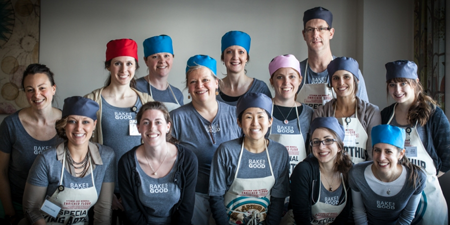 Bake for Good Minneapolis (Photo courtesy of Jena Carlin, Little Rusted Ladle). Back row, left to right: Julia Reed (King Arthur Flour), Katherine Taylor (Cookie + Kate), Amanda Rettke (I Am Baker), Susan Reid (King Arthur Flour), Brenda Score (A Farm Girl's Dabbles), Stefani Pollack (The Cupcake Project), Jim Rude (Little Rusted Ladle), Taylor Ellingston (Greens and Chocolate), Kristin Rosenau (Pastry Affair). Front, left to right: Jena Carlin (Little Rusted Ladle), Natasha Wood (King Arthur Flour), Alice Choi (Hip Foodie Mom), Shaina Olmenson (Food for my Family), and Erin Clark (The Law Student's Wife)