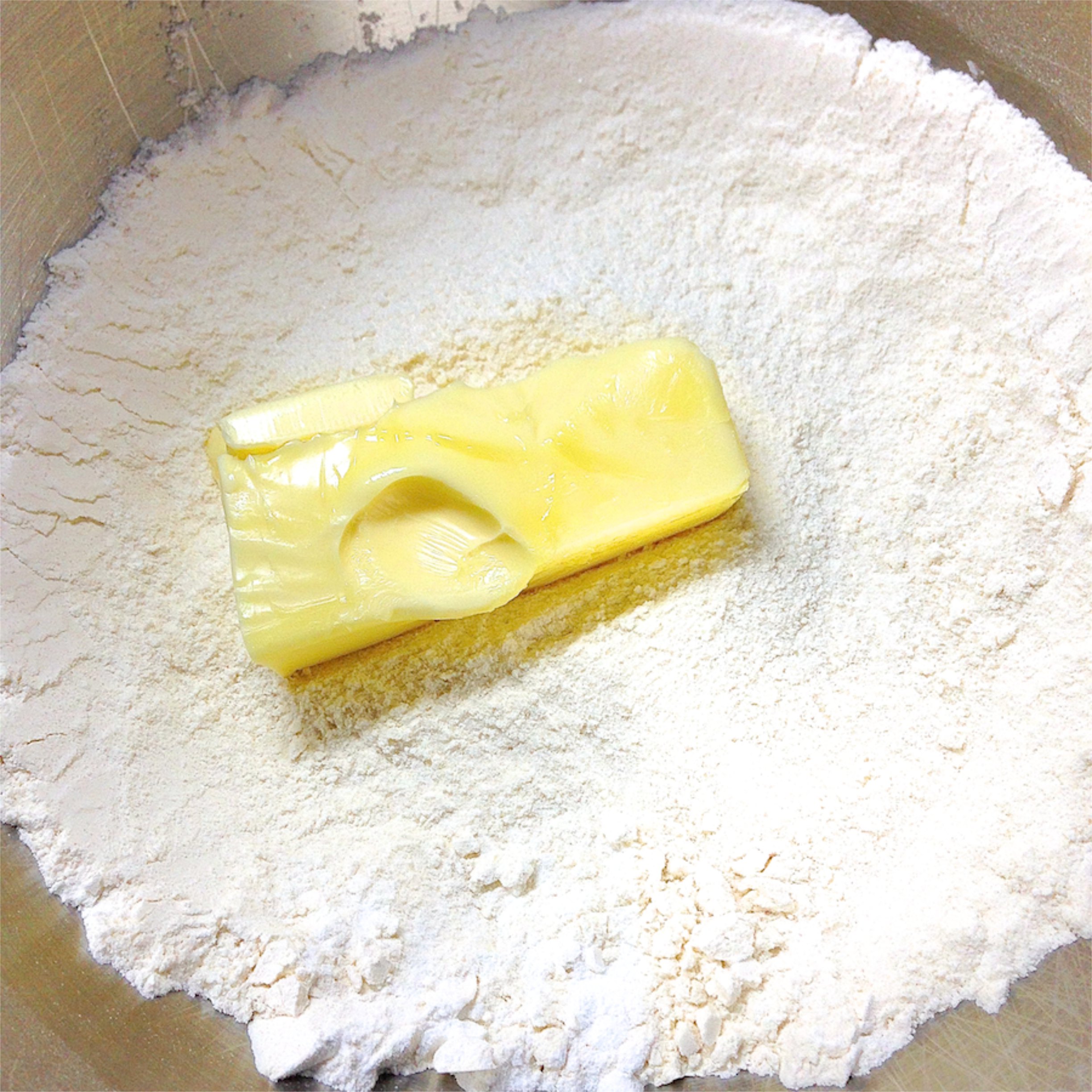 Take 6 tablespoons (85g) of your room-temperature butter, and plop it down into the middle of the bowl of dry ingredients. You can cut the butter into pats first, or not; if it's truly at room temperature, it won't really matter.
