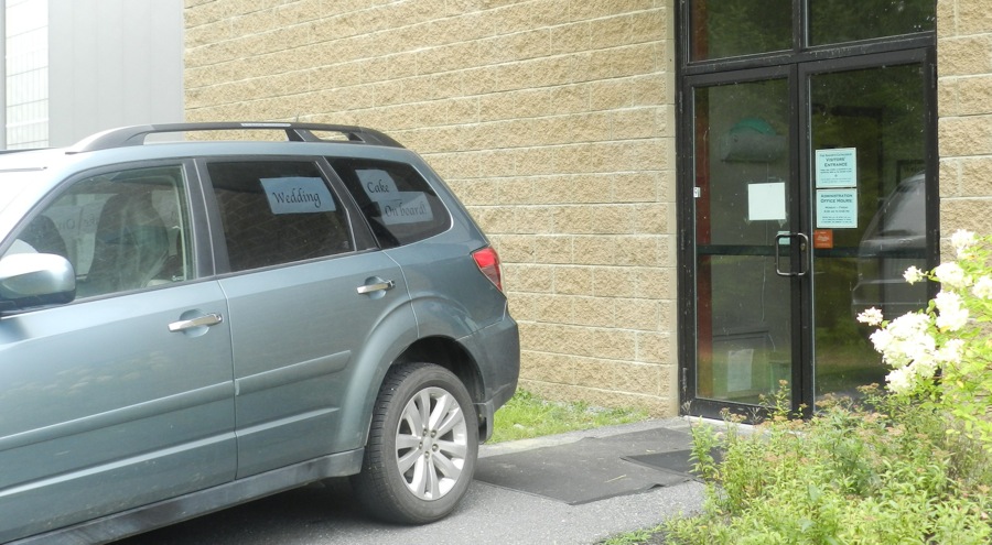 Put signs in the car window. It decreases the potential for road rage from other drivers. When they come up on you driving your white-knuckle 25mph, they're aggravated at first. Then they'll see the "Wedding Cake on Board" sign, and you'll probably get smiles and waves.