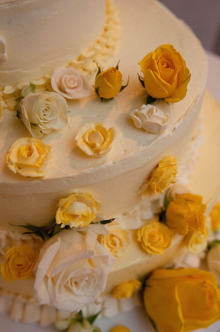 What flavors? My writing partner Gwen and her now husband Ben (our Web designer) wanted something light, sort of citrus-y, but a little different. We settled on white cake soaked with citrus simple syrup, filled with passionfruit curd and frosted with passionfruit Italian buttercream.