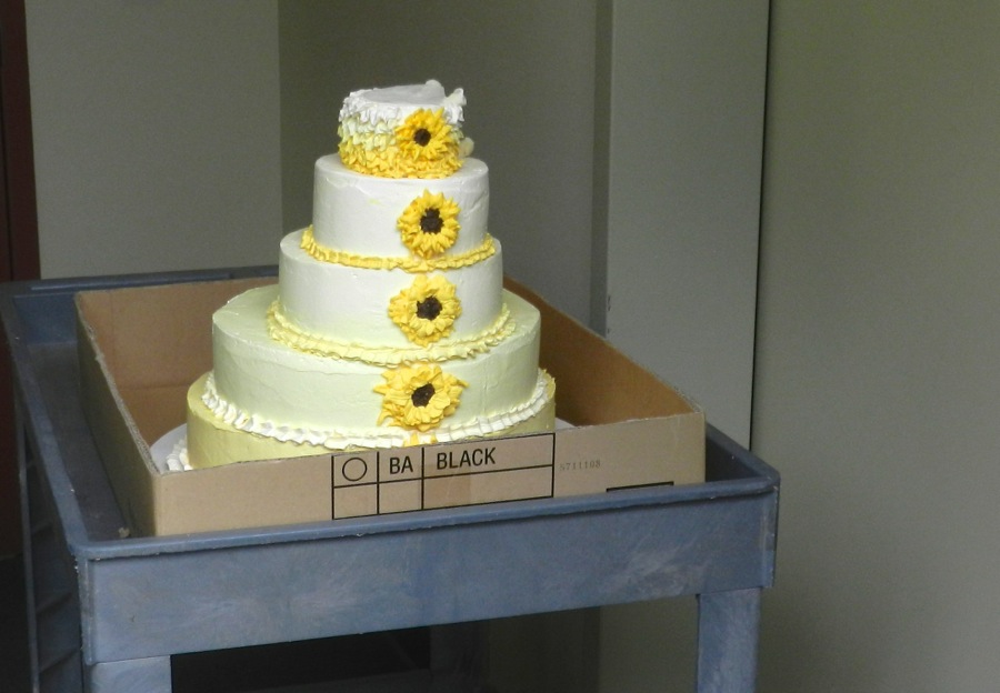 Setting up: If you're handing the cake off to someone, that's really all you have to do. Make sure they don't put it in a cooler with a bunch of fish! To taste its best, the cake should be given some time to warm up to room temperature. The bigger the cake, the more time this takes. Usually, if the cake is on display before people come into the room for the reception, it works out – as long as the room isn't sweltering. See the notes below about getting your equipment back.