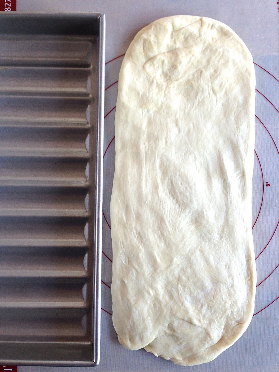 Gently deflate the dough, and stretch it until it's about 15" long and 6" wide.