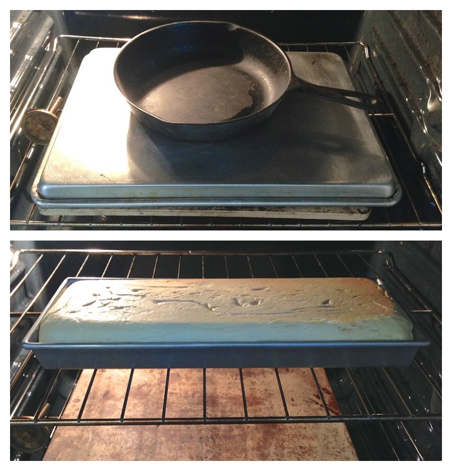 Put the covered buns into the oven, weighing the baking sheet down with something heavy and oven-safe; a cast-iron skillet works well.
