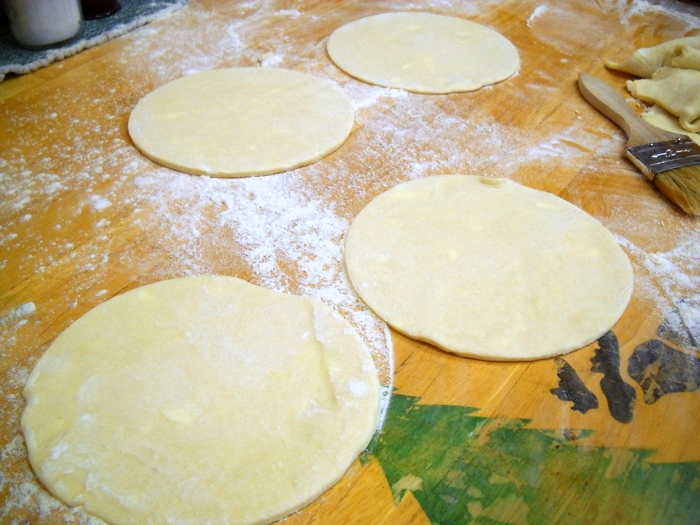 Roll your chilled pie dough to 1/8" thickness on a well-floured surface. Use a round cutter between 5" and 6" diameter to cut out six rounds at a time. I used a 6" round cutter and it was just a touch too large; but it certainly was workable.
