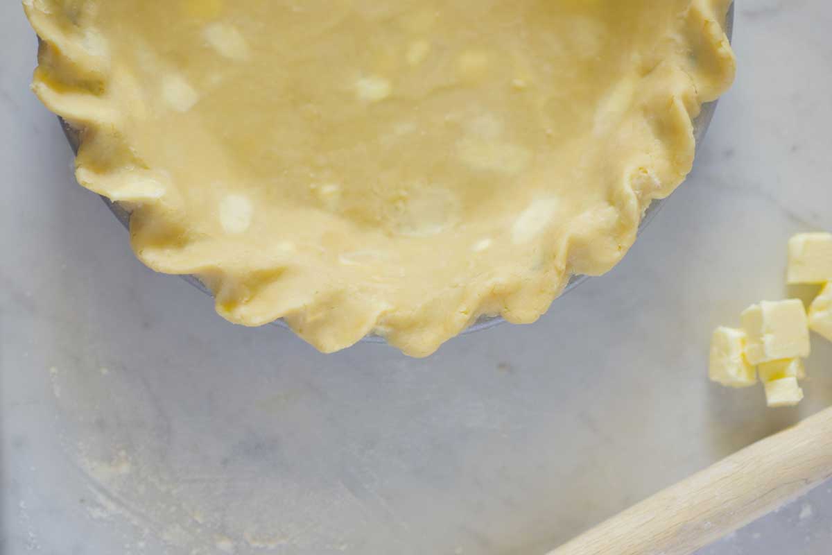 • Its combination of two fats – butter and shortening. Shortening gives the crust structure, keeping those pretty crimps in shape and preventing the crust from sagging. And butter adds its signature flavor. Both fats contribute to flakiness.