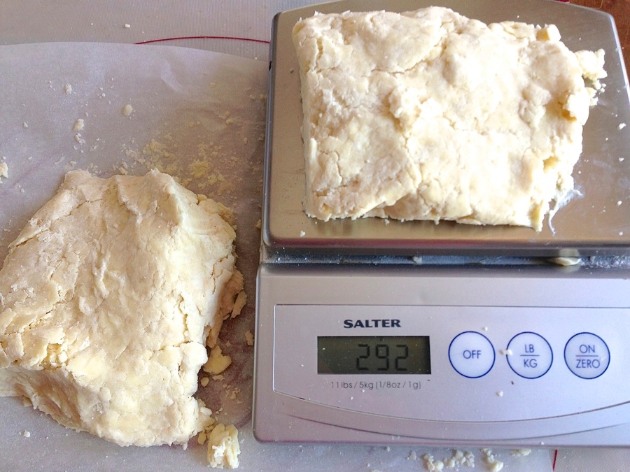 Once your flour and fats are combined, and you've added enough water that large clumps have started to form – but the dough isn't holding together yet – dump everything out onto a sheet of parchment or waxed paper.