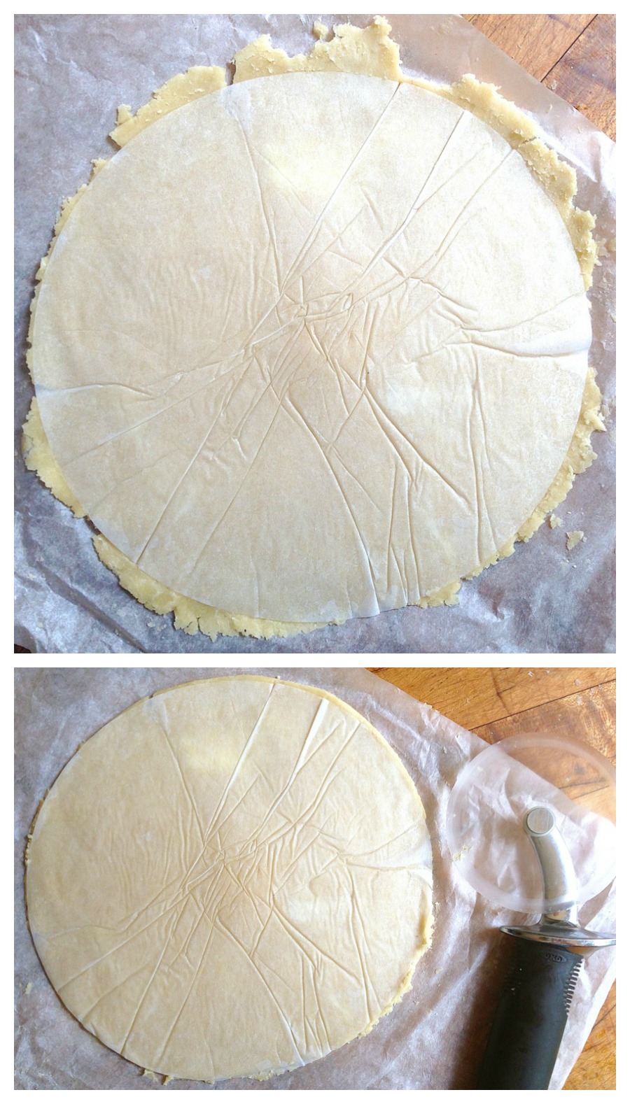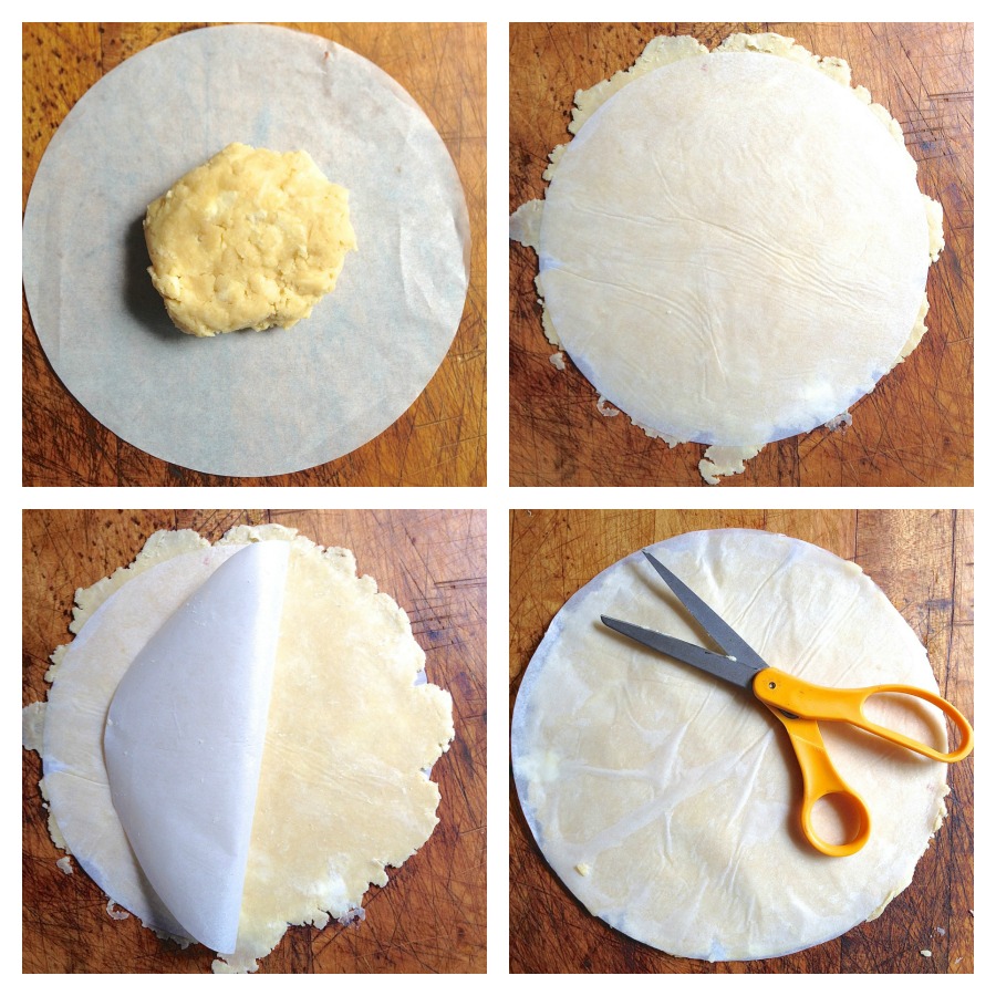The other half, I roll between two 9" parchment rounds, the kind you use to line a cake pan.
