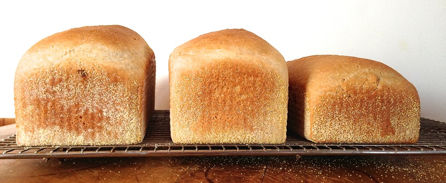 Loaves, left to right: 100% all-purpose flour; 50% all purpose/50% whole wheat; 100% whole wheat flour.