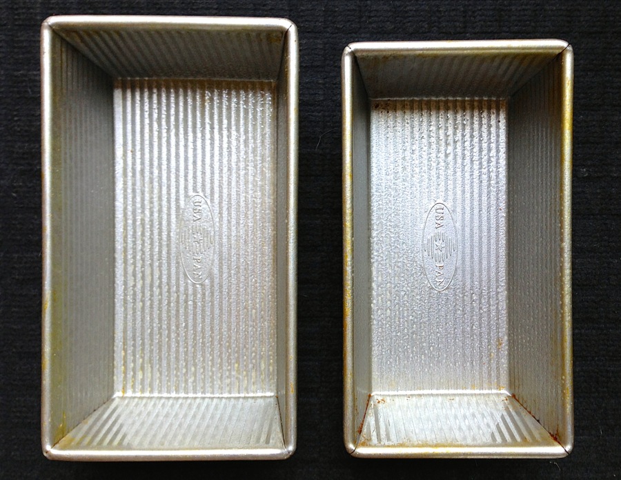 See these two pans? The one on the left is a 9" x 5" loaf pan, most commonly used for "quick" breads: batter breads that rely on baking powder or baking soda for leavening. Think banana bread, zucchini, pumpkin... you get the picture.