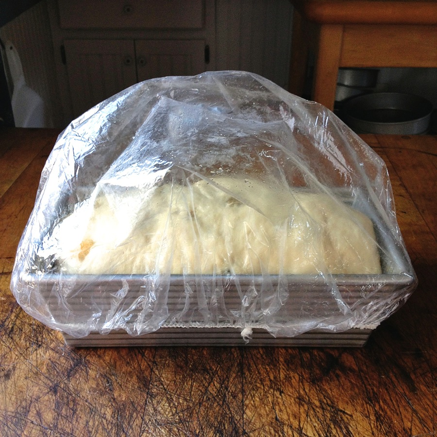 Use a clear plastic cap, if you can; you get a better view of what's going on inside. The elastic keeps the cap firmly anchored to the pan, while the plastic on top "poofs" nicely, sheltering your rising loaf without actually touching it.