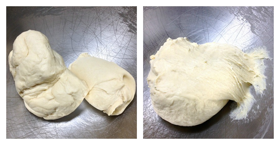 See that dough on the right? It's soft, but not overly sticky; e.g., it doesn't cling to your hands when you pick it up. Instead, it just barely "kisses" the side of the bowl, if you're kneading in a stand mixer. If you're kneading by hand, it will stick to your kneading surface in a "tacky" way, rather than viscously, like glue.