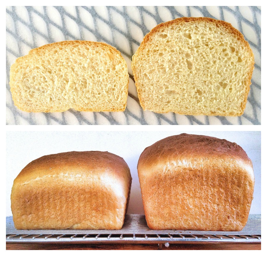 The loaf on the left was made with 2 tablespoons less water than the loaf on the right. That translates to a 12% difference.