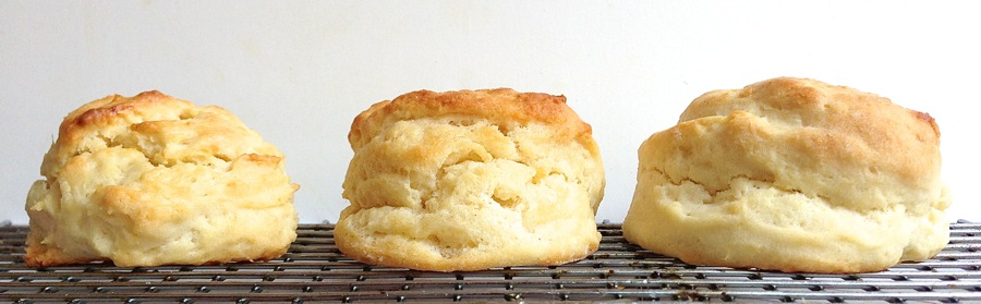 Left to right, you see Never-Fail scooped biscuits; Bakewell Cream Biscuits; and Never-Fail cut biscuits. I'd say there's no appreciable difference in rise.