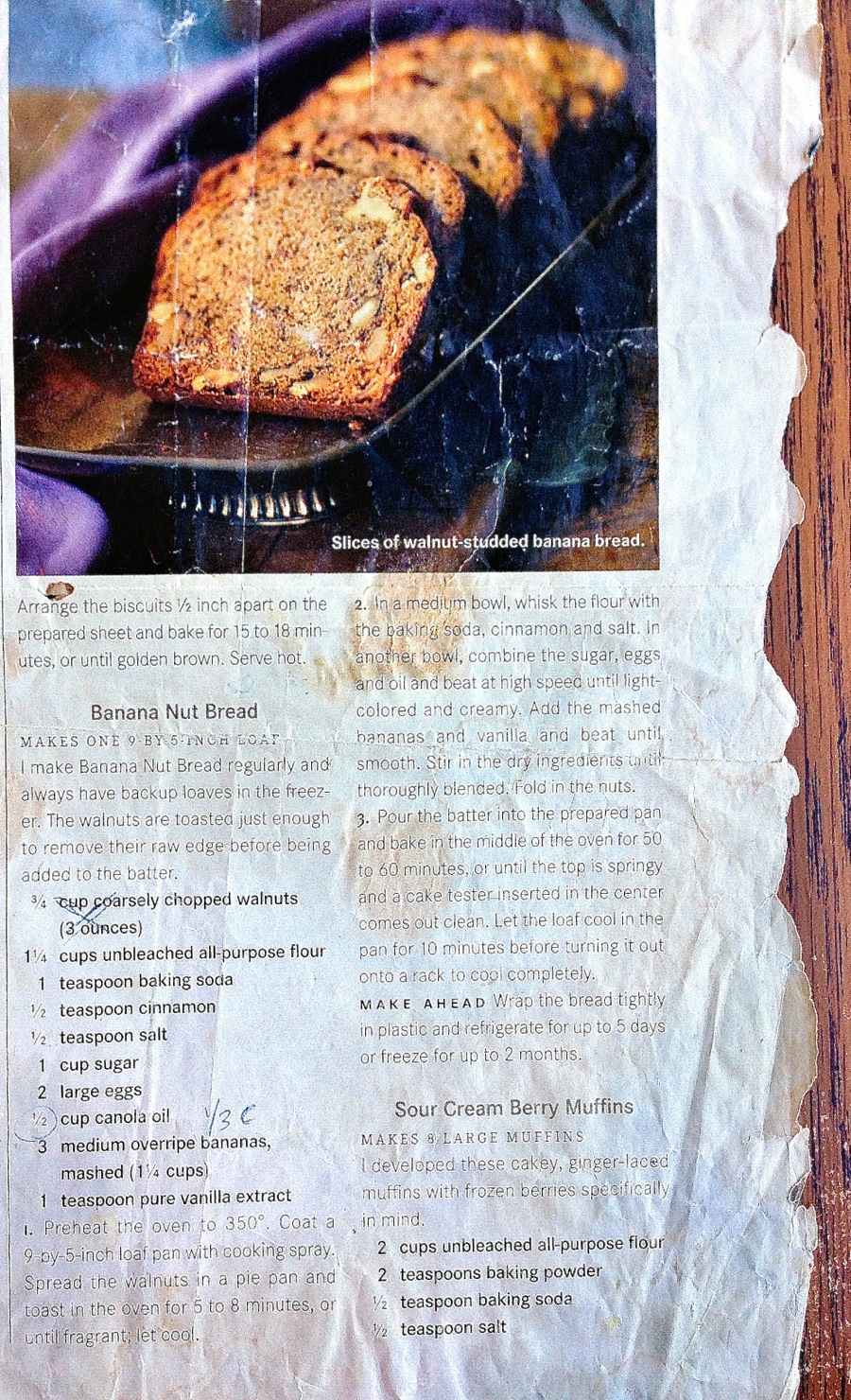 The recipe page torn from Food & Wine that started me on my road to banana bread fame is old and worn; and having been asked to share, I've copied it more than a few times. I'd lost track of that original page until a few years ago, when Lily and I were baking and she found it tucked away inside my Joy of Cooking.