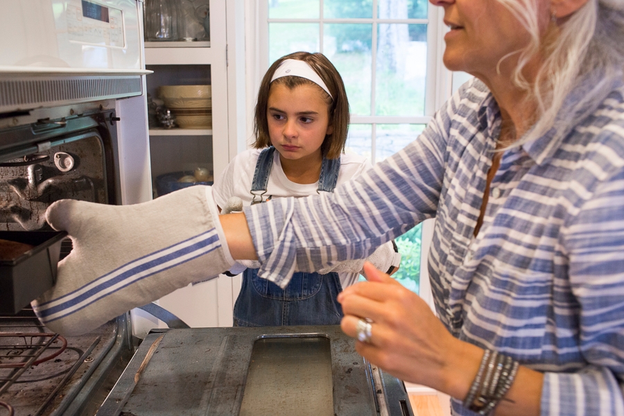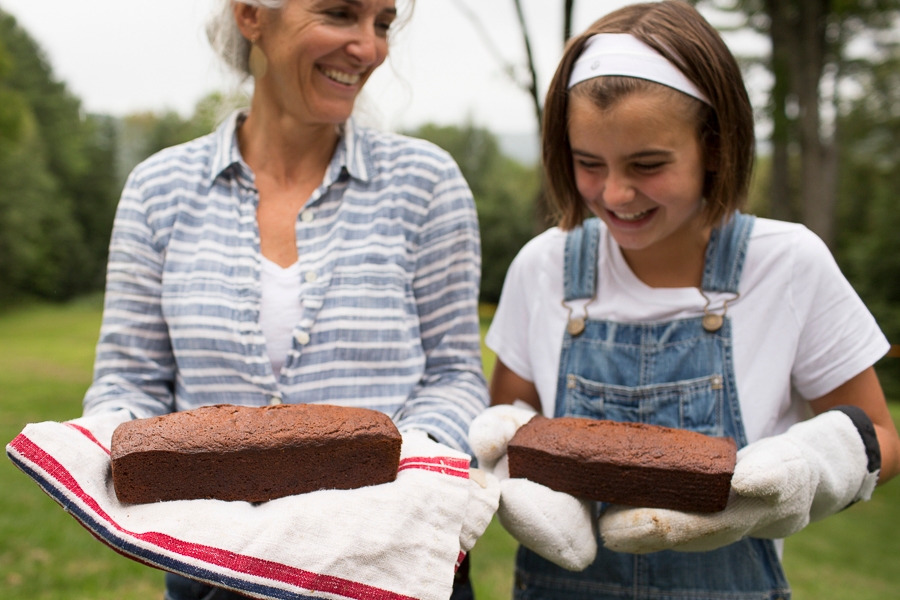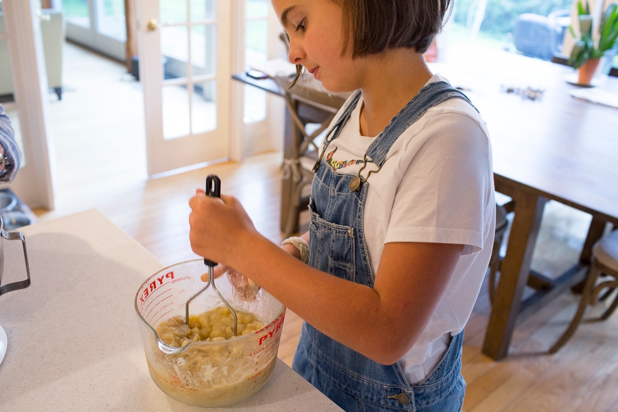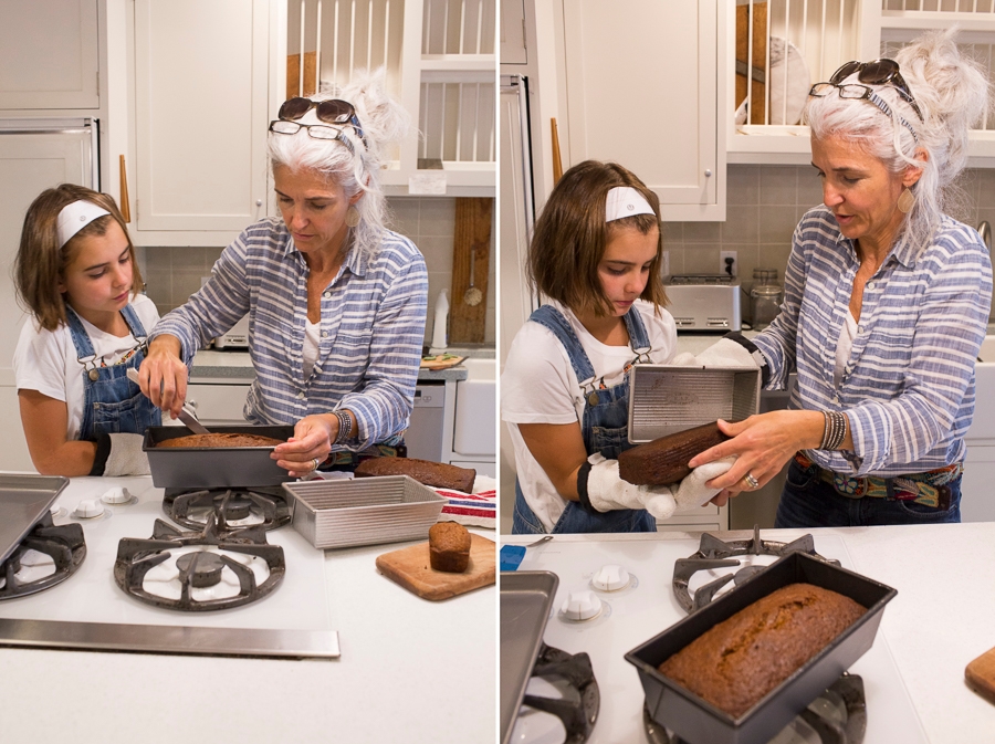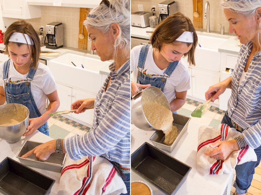 1. Preheat the oven to 350°F. Spray a 9" x 5" loaf pan with cooking spray. (We stole a little batter for a mini loaf – which Lily is spraying above – because she loves minis!)