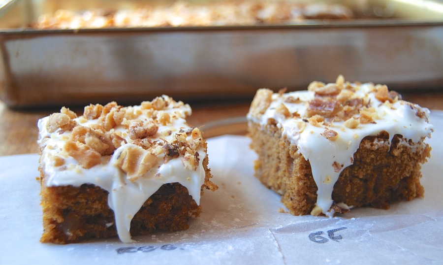 OK, here's some context. I recently whipped up one of my favorite fall recipes, Pumpkin Cake Bars. Deep-orange, moist, cake-type bars, nicely spiced, they're crowned with rich cream cheese icing and toasted walnuts.