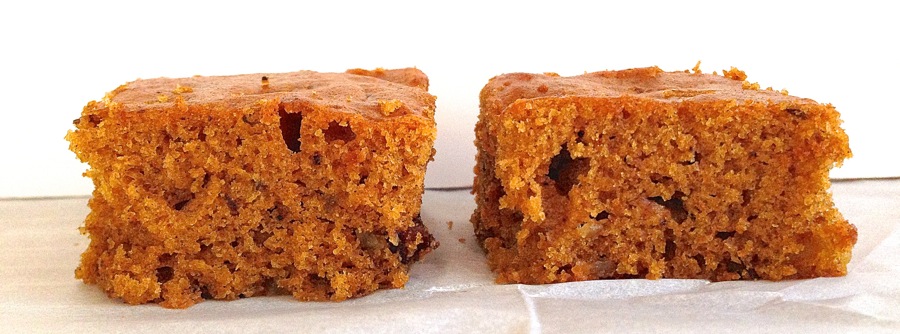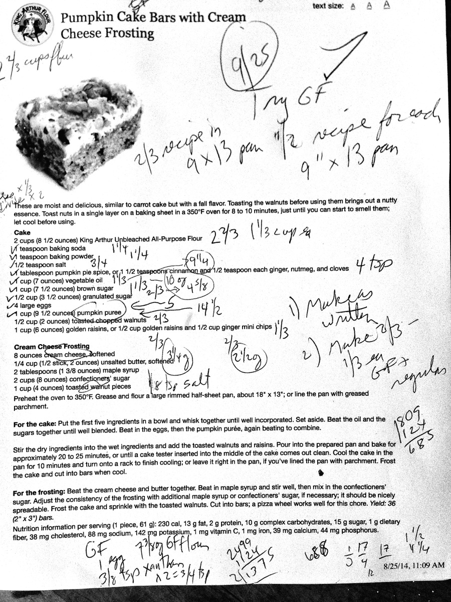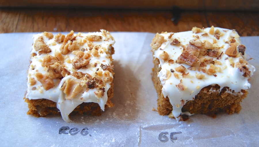 No need for a super-deep dive, but this formula meant I needed to take the original 18" x 13" recipe, multiply it by 1 1/3, then divide the resulting batter in half – one half becoming gluten-full, the other gluten-free, each baked in a 9" x 13" pan.