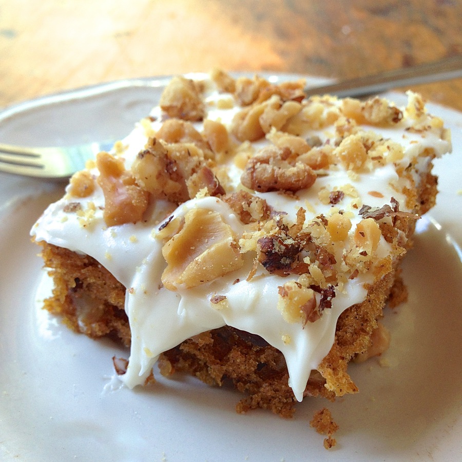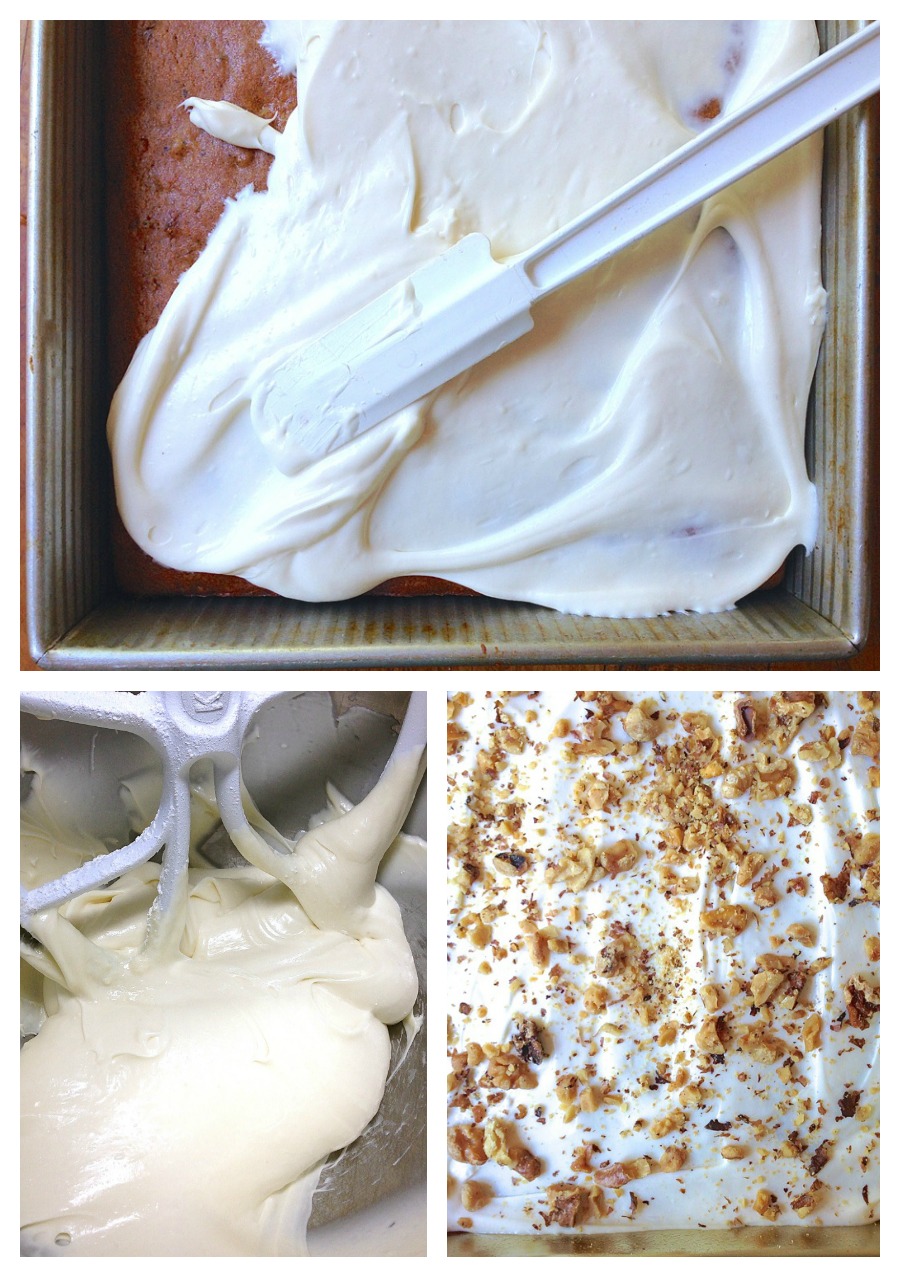 Whip up the cream cheese frosting, spread it on both cakes, sprinkle with toasted walnuts...