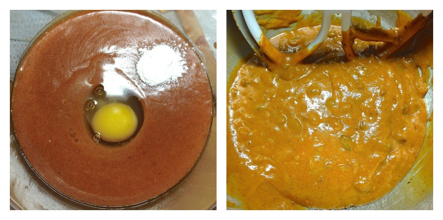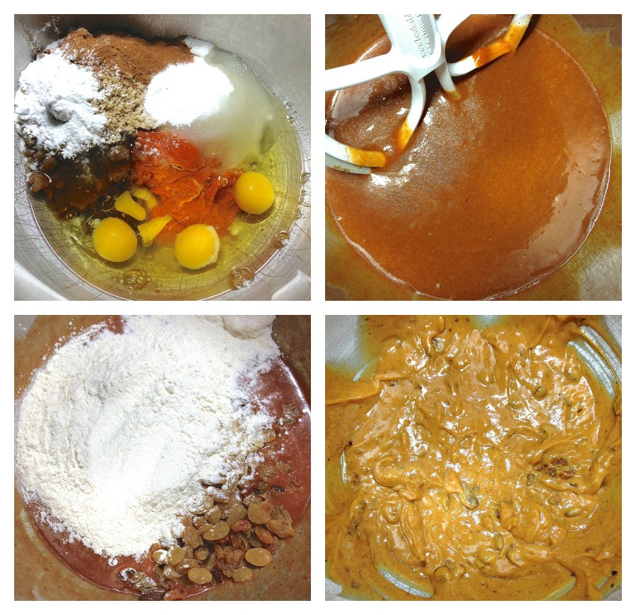 As you can see, I've stirred together everything except the flour, raisins/ginger, and nuts. At this point, I divide the smooth batter in half, setting half aside for my gluten-free experiment.