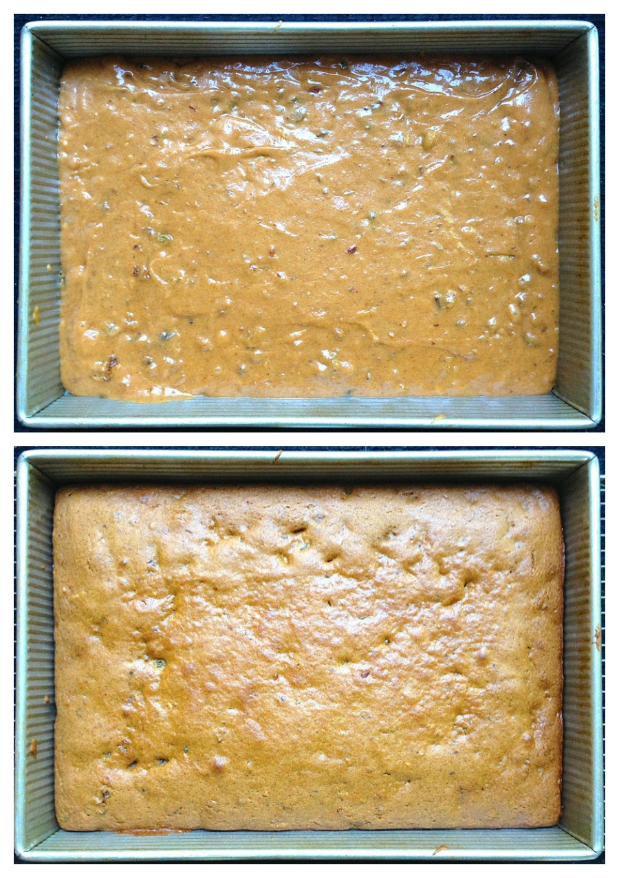 I then stir all-purpose flour, nuts, and raisins/ginger into the first bowl of batter, and pour it into a 9" x 13" pan.