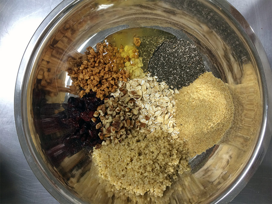 It's really crucial to place everything in the bowl in little piles. I found that to be the case, at least. It's a pretty lengthy list of dry ingredients, and getting distracted/called away could mean you lose track. Then you have to pick through your ingredients to try to remember. These bars aren't supposed to be a difficult thing to put together; let's keep it that way!