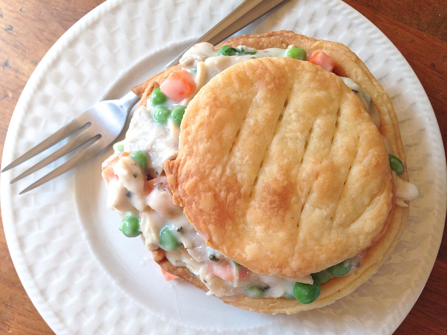 Stir in 1 teaspoon herbes de Provence (or your favorite combination of dried herbs, and/or a touch of poultry seasoning), 2 cups diced cooked chicken, and 2 cups cooked mixed vegetables or peas/carrots (I used frozen/cooked). Heat until very hot.