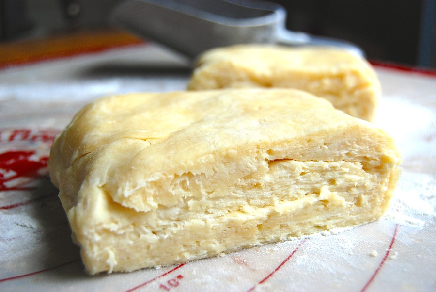 Cut the dough in half. Look at those layers! You can easily see the three folds, but can you also spot those other striations? That's what'll make this dough flaky.