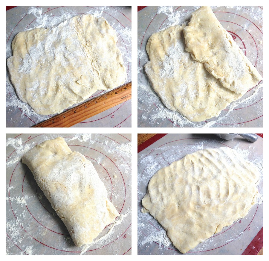 Roll/pat the dough into an 8" x 10" rectangle. Dust both sides of the dough with flour, and starting with a shorter end, fold it in three like a business letter.