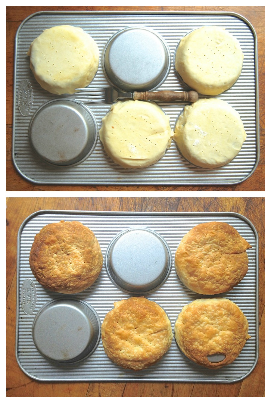 I settled the rounds into the pan; pricked them so they wouldn't puff, and baked them until brown.