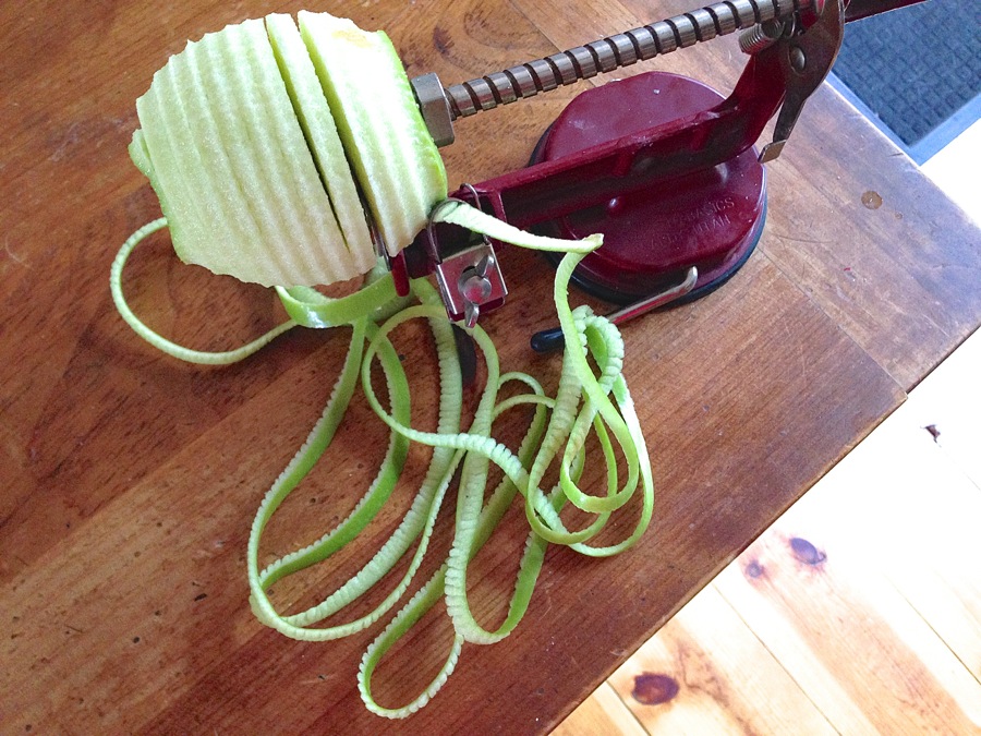 Back in the old days, we peeled and chopped by hand, and that remains my favorite method for this recipe. But if you have a peeler/corer/chopper, it makes the task fly right by.