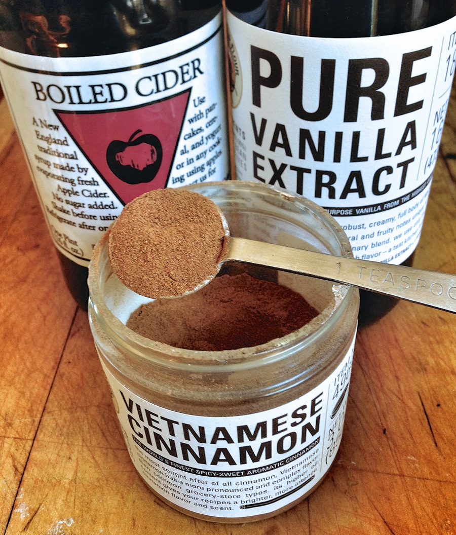 Ah, the big reveal. The two new ingredients that I add to my Dad's classic mixture of sugar and cinnamon; boiled cider, and vanilla.