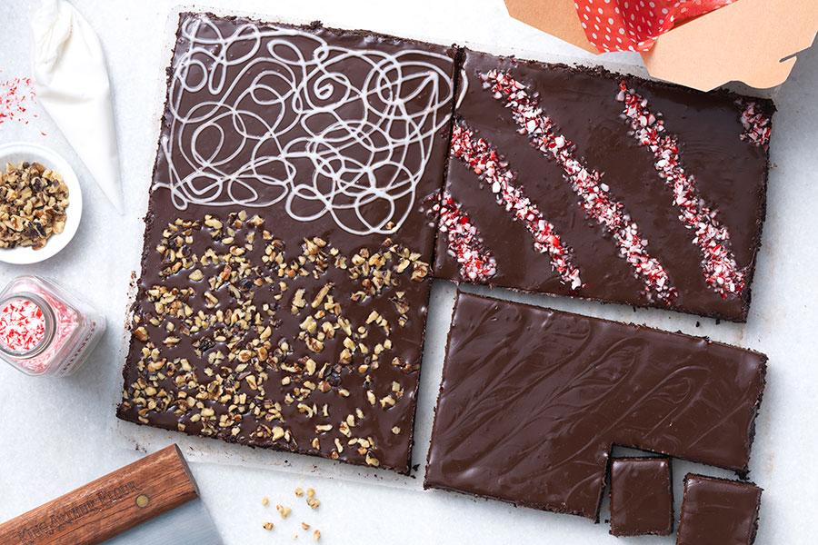 Have no fear, dear fellow baker, we are here to help. Our recipe for one big batch of brownies, baked in a half-sheet (18" x 13") pan then gilded with ganache and a variety of festive toppings, is just the thing you need to have those home-baked goods ready in a flash.