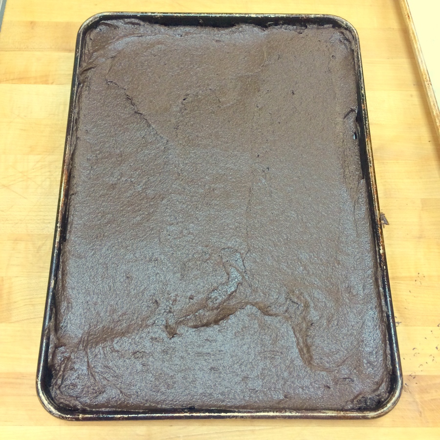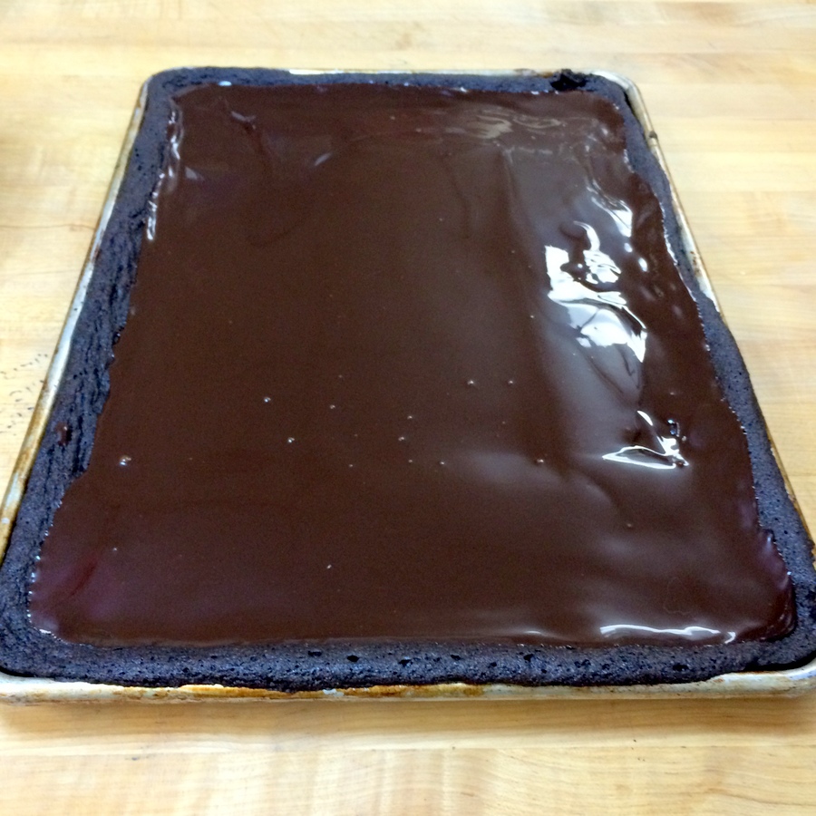 The brownies are baked and just barely warm to the touch. Pour on the ganache and spread it evenly. I can't say enough good things about using an offset spatula for this task.