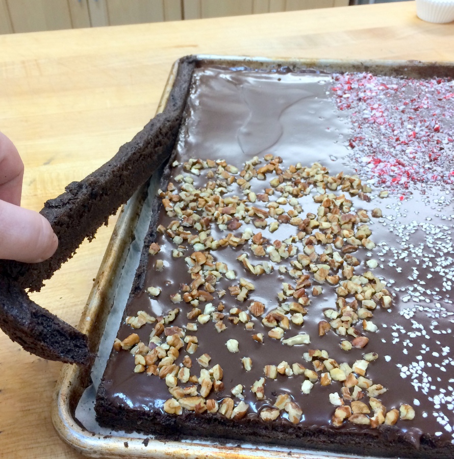 Start by whipping up a batch of our Fudge Brownies, using the big batch version listed in the baker's tips section. The measurements are all right there, along with baking time and temperature, but I'll just give you a quick rundown here: