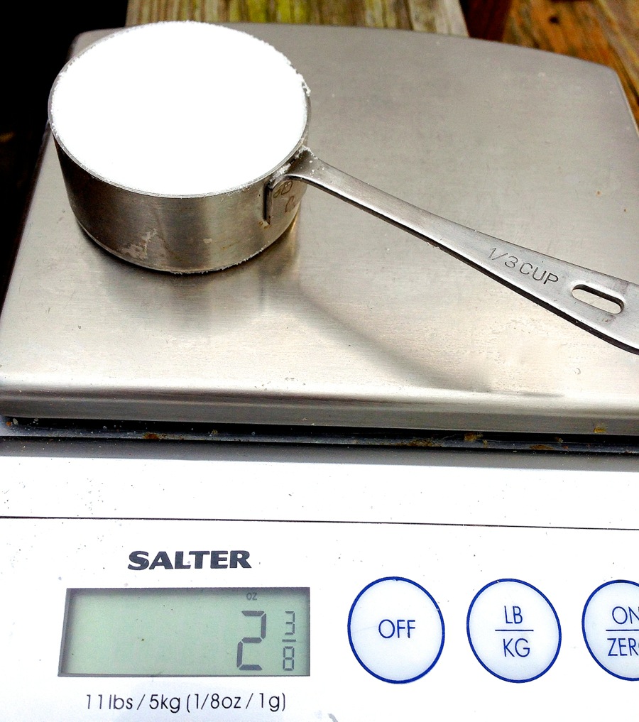 Using your scale, weigh the empty cup. Dip it into the sugar canister, and use the back of a table knife to level it off. Set the cup on the scale.