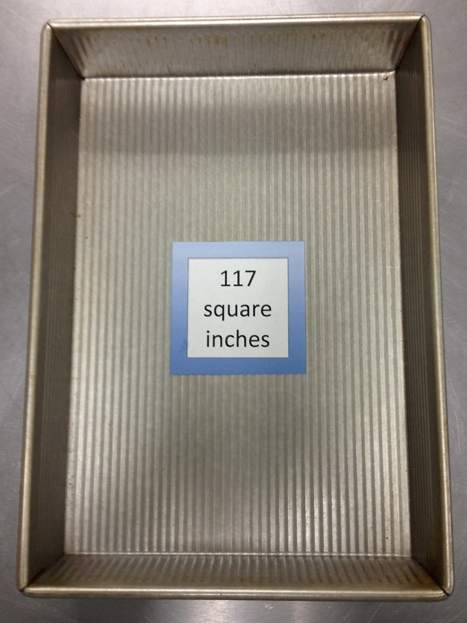 Or, you're a small household, and really don't want to stare down a 9" x 13" pan of brownies for two weeks. You can cut the recipe in half, and bake it in an 8" square pan. The conversion factor there is .5. How did I know what size pan to bake in? I compared the bottom surface area of the pans involved. Take a look: