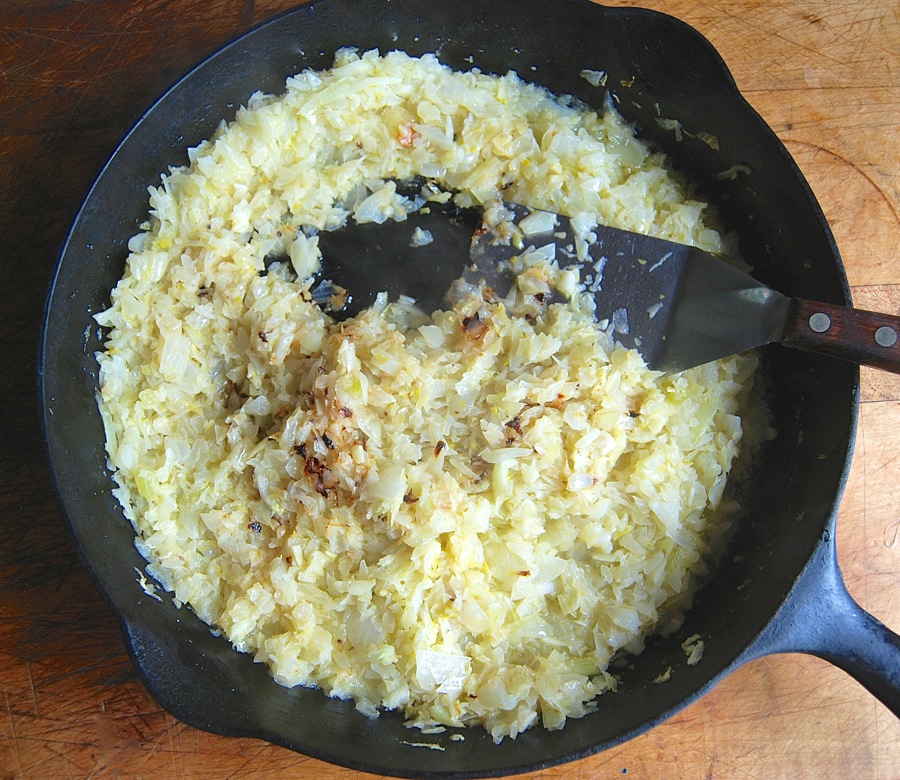 Gently sauté 3 cups (425g) peeled, diced onions (about 3 medium onions) and 1 cup (128g) diced celery, including green tops, until soft and barely beginning to brown, about 20 minutes.